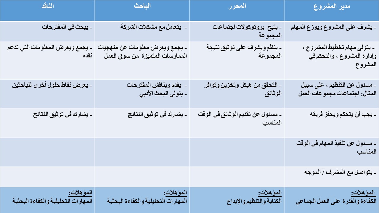 إطار العمل يؤدي المشاركون أدوارًا معينة (مدير مشروع ، محرر ، عالم ، نقاد) ؛ تكليف دراسة حالة ؛ يركز هدف التعلم على تعزيز الكفاءة المهنية.